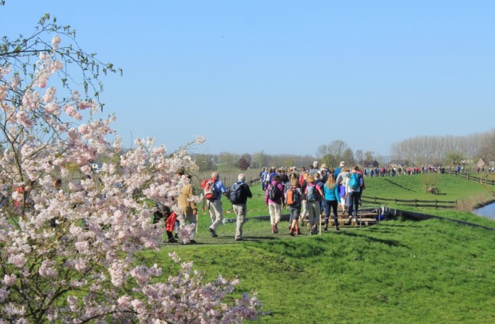 Hier tenslotte nog een mooi plaatje, met een ”kudde” wandelaars die geniet van de bloesem langs de Linge.