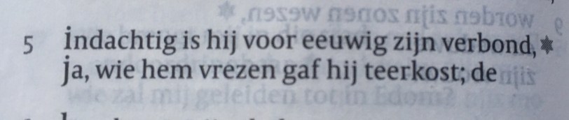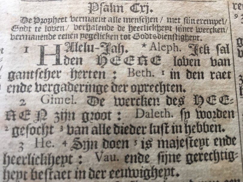 En een foto uit de oude Statenbijbel waar ze de Hebreeuwse letters (alef, bet, …) bij de teksten hebben vermeld.