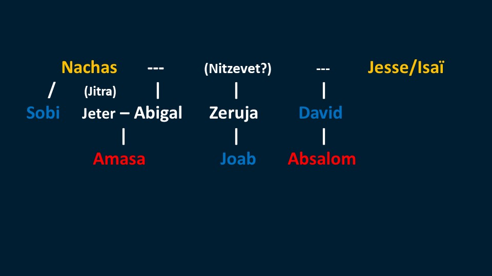 - een eerste lastige kwestie is de naam van de vader van Abigal: Nachas. Zijn dochter heet Abigal (of Abigaïl – een andere uiteraard dan de vrouw van David die eerder met Nabal getrouwd was). Abigal was een zus van Zeruja en David. Dus hoe kan het dan dat haar vader Nachas heet? Dat moet dan toch Jesse/Isaï zijn? In de Talmoed wordt Nachas daarom wel gelijkgesteld met Isaï. Al blijft dit moeilijk, want Nachas betekent ”slang”, en die naam associeer je niet met Isaï (al heeft men hier in de Talmoed wel een ”oplossing” voor, die in dit kader overigens wat ver voert).